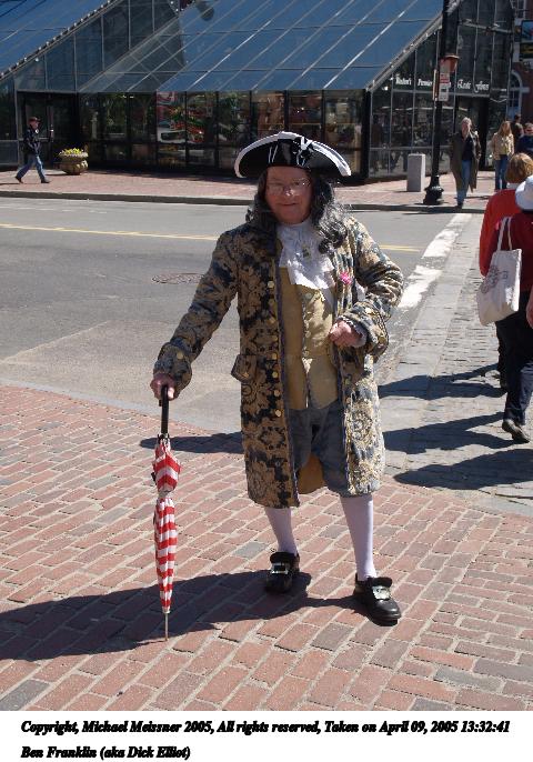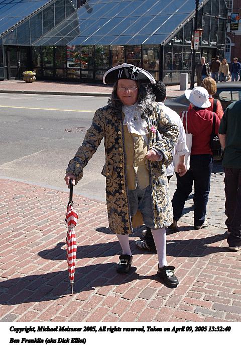 Picture #86: Ben Franklin (aka Dick Elliot) #2 480x686, 88,040 bytes (86K), (html file) Copyright, Michael Meissner 2005, All rights reserved Olympus E-1 camera with Olympus 14-54mm f/2.8-3.5 lens f/6.3, ISO 100, 1/250 sec, 23.0mm, auto mode, SHQ, matrix metering, -2 contrast, +2 sharpening 35mm equivalent focal length 46.0mm Taken by Michael Meissner on April 09, 2005 13:32:41 Last modified on April 10, 2005 at 09:18 |