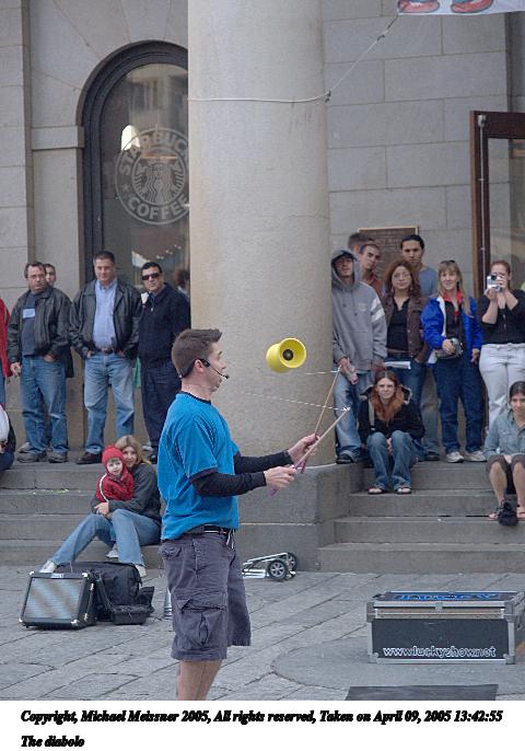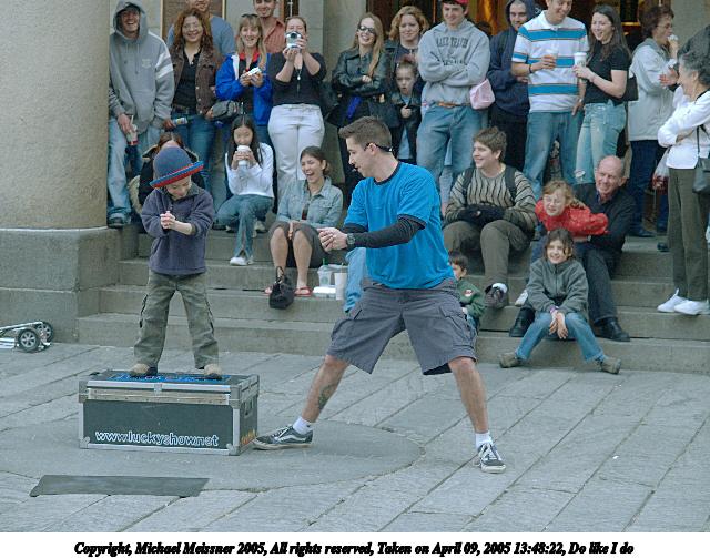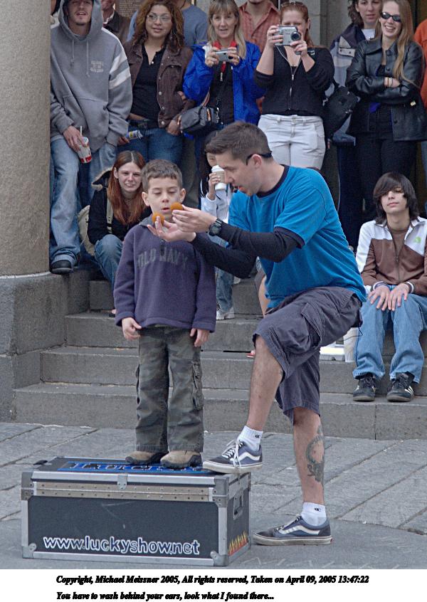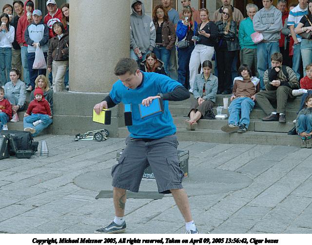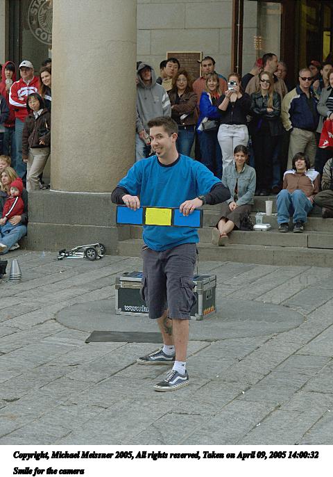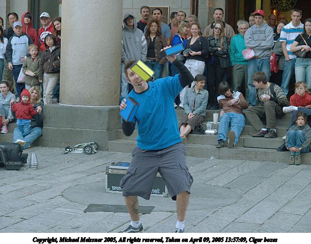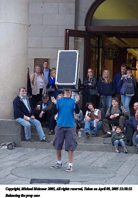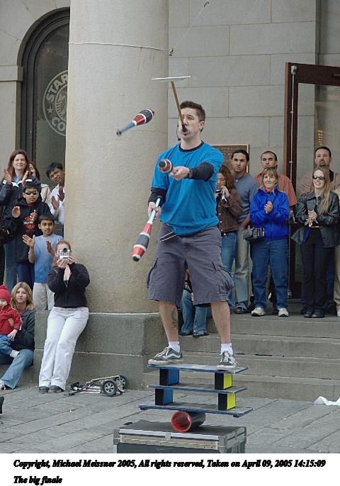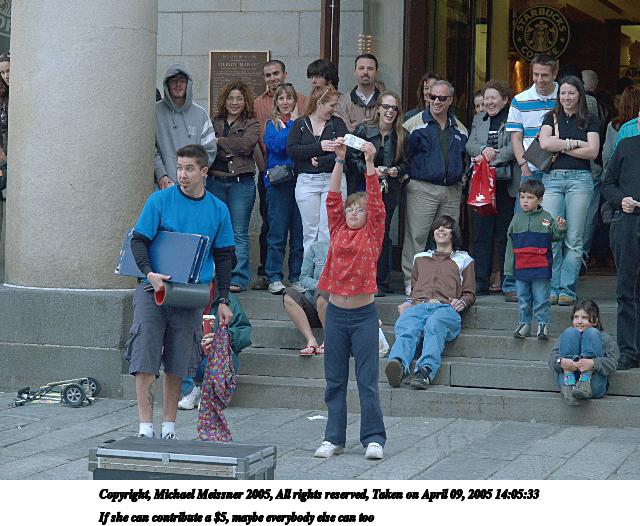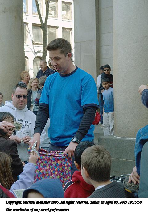 Picture #66: The conclusion of any street performance 480x686, 72,958 bytes (72K), (html file) Copyright, Michael Meissner 2005, All rights reserved Olympus E-1 camera with Olympus 14-54mm f/2.8-3.5 lens f/5.0, ISO 400, 1/200 sec, 38.0mm, auto mode, SHQ, matrix metering, -2 contrast, +2 sharpening 35mm equivalent focal length 76.0mm Taken by Michael Meissner on April 09, 2005 14:15:58 Last modified on April 12, 2005 at 09:37 |