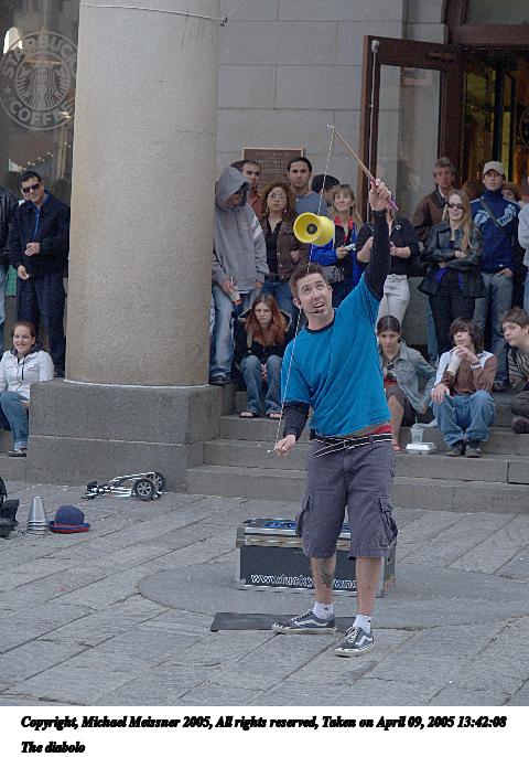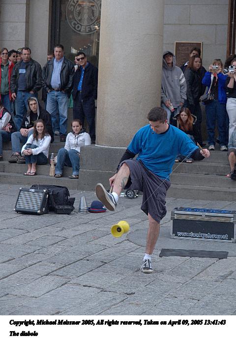 Picture #80: The diabolo #3 480x686, 69,374 bytes (68K), (html file) Copyright, Michael Meissner 2005, All rights reserved Olympus E-1 camera with Olympus 14-54mm f/2.8-3.5 lens f/3.5, ISO 200, 1/125 sec, 54.0mm, auto mode, SHQ, matrix metering, -2 contrast, +2 sharpening 35mm equivalent focal length 108.0mm Taken by Michael Meissner on April 09, 2005 13:42:55 Last modified on April 12, 2005 at 07:56 |