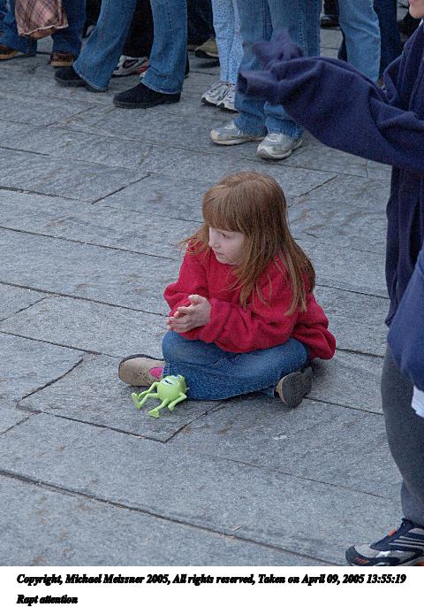 Picture #77: Rapt attention 480x686, 84,347 bytes (83K), (html file) Copyright, Michael Meissner 2005, All rights reserved Olympus E-1 camera with Olympus 14-54mm f/2.8-3.5 lens f/4.5, ISO 400, 1/200 sec, 54.0mm, auto mode, SHQ, matrix metering, -2 contrast, +2 sharpening 35mm equivalent focal length 108.0mm Taken by Michael Meissner on April 09, 2005 13:55:19 Last modified on April 12, 2005 at 08:04 |
