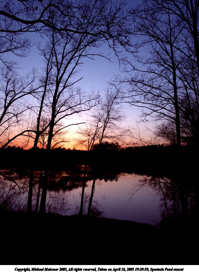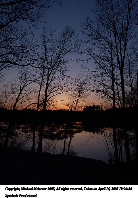 Picture #26: Spectacle Pond sunset #2 655x897, 152,156 bytes (149K), (html file) Copyright, Michael Meissner 2005, All rights reserved Olympus E-1 camera with Olympus 14-54mm f/2.8-3.5 lens f/4.5, ISO 100, 1/100 sec, 14.0mm, auto mode, SHQ, spot metering, -2 contrast, +2 sharpening, Exposure bracketing (shot 1) 35mm equivalent focal length 28.0mm Taken by Michael Meissner on April 16, 2005 19:29:59 Last modified on April 28, 2005 at 22:41 |