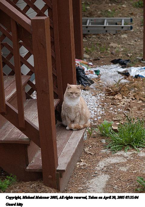 Picture #22: Guard kitty 480x686, 98,582 bytes (97K), (html file) Copyright, Michael Meissner 2005, All rights reserved Olympus E-1 camera with Olympus 14-54mm f/2.8-3.5 lens f/3.5, ISO 200, 1/80 sec, 52.0mm, auto mode, SHQ, matrix metering, -2 contrast, +2 sharpening 35mm equivalent focal length 104.0mm Taken by Michael Meissner on April 30, 2005 07:35:04 Last modified on May 01, 2005 at 07:48 |