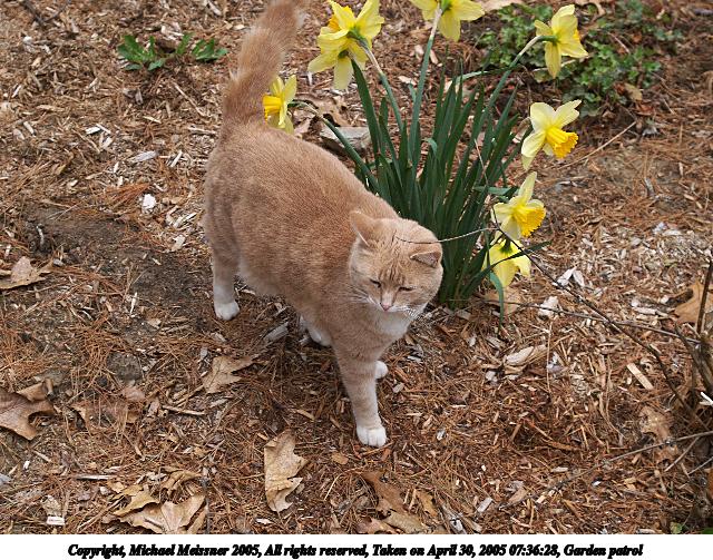 Picture #18: Garden patrol 640x503, 138,996 bytes (136K), (html file) Copyright, Michael Meissner 2005, All rights reserved Olympus E-1 camera with Olympus 14-54mm f/2.8-3.5 lens f/3.5, ISO 200, 1/100 sec, 31.0mm, auto mode, SHQ, matrix metering, -2 contrast, +2 sharpening 35mm equivalent focal length 62.0mm Taken by Michael Meissner on April 30, 2005 07:36:28 Last modified on May 01, 2005 at 08:45 |
