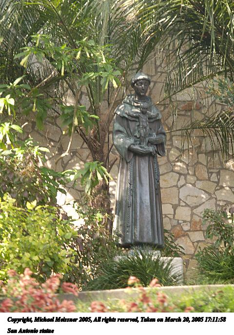 Picture #17: San Antonio statue 480x686, 108,288 bytes (106K), (html file) Copyright, Michael Meissner 2005, All rights reserved Olympus E-1 camera with Olympus 14-54mm f/2.8-3.5 lens f/3.5, ISO 100, 1/30 sec, 54.0mm, auto mode, SHQ, matrix metering, bias 0.3, -2 contrast, +2 sharpening, auto + manual focus 35mm equivalent focal length 108.0mm Extra equipment used: Polarizer filter Taken by Michael Meissner on March 20, 2005 17:11:58 Last modified on May 01, 2005 at 22:17 |