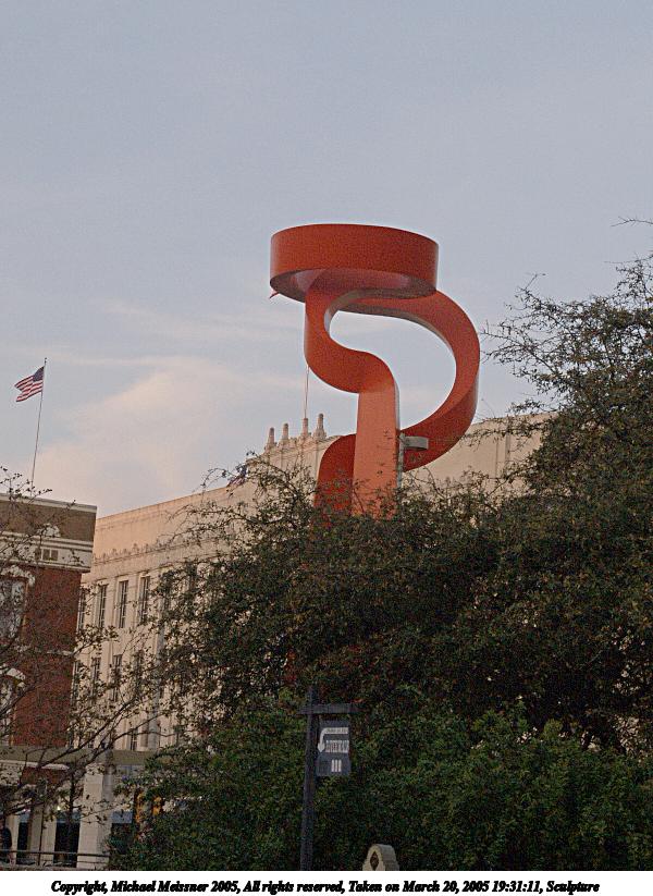 Picture #2: Sculpture 600x823, 106,203 bytes (104K), (html file) Copyright, Michael Meissner 2005, All rights reserved Olympus E-1 camera with Olympus 14-54mm f/2.8-3.5 lens f/6.3, ISO 400, 1/320 sec, 33.0mm, auto mode, SHQ, matrix metering, bias 0.3, -2 contrast, +2 sharpening, continous focus 35mm equivalent focal length 66.0mm Extra equipment used: Polarizer filter Taken by Michael Meissner on March 20, 2005 19:31:11 Last modified on May 01, 2005 at 23:01 |