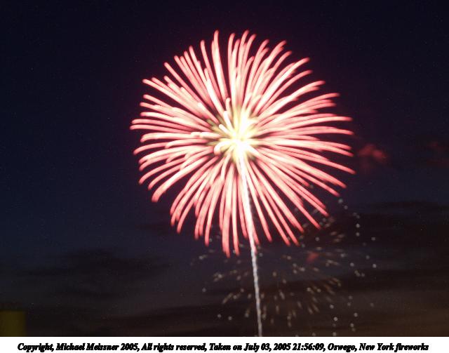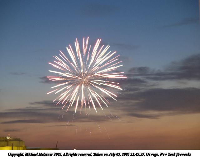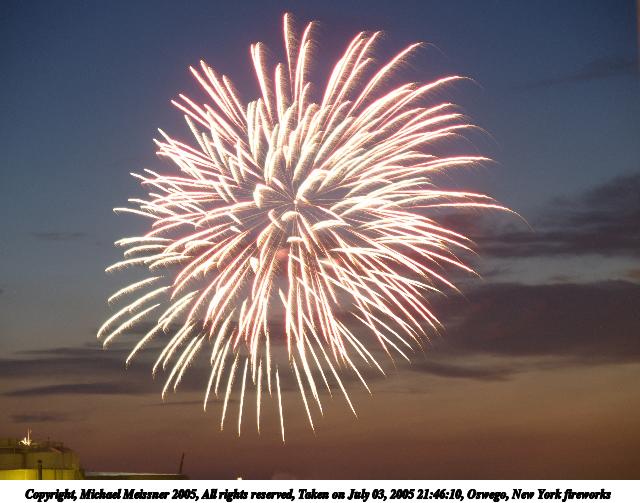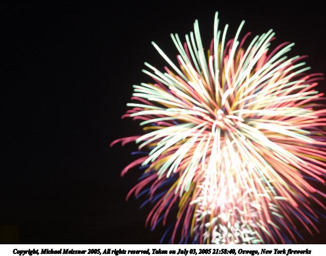 Picture #10: Oswego, New York fireworks #10 640x503, 48,868 bytes (48K), (html file) Copyright, Michael Meissner 2005, All rights reserved Olympus E-1 camera with Olympus 14-54mm f/2.8-3.5 lens f/5.6, ISO 100, 6 sec, 54.0mm, manual mode, SHQ, matrix metering, -2 contrast, +2 sharpening, manual focus 35mm equivalent focal length 108.0mm Extra equipment used: Tripod, RM-CB01 cable release Taken by Michael Meissner on July 03, 2005 21:56:09 Last modified on July 04, 2005 at 21:17 |