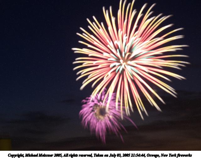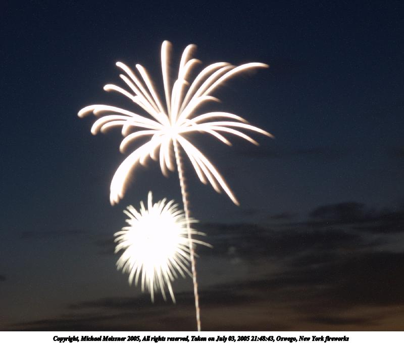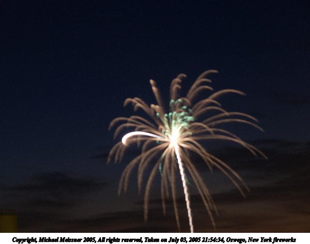 Picture #8: Oswego, New York fireworks #8 640x503, 58,280 bytes (57K), (html file) Copyright, Michael Meissner 2005, All rights reserved Olympus E-1 camera with Olympus 14-54mm f/2.8-3.5 lens f/5.6, ISO 100, 5.3 sec, 54.0mm, manual mode, SHQ, matrix metering, -2 contrast, +2 sharpening, manual focus 35mm equivalent focal length 108.0mm Extra equipment used: Tripod, RM-CB01 cable release Taken by Michael Meissner on July 03, 2005 21:54:44 Last modified on July 04, 2005 at 21:15 |