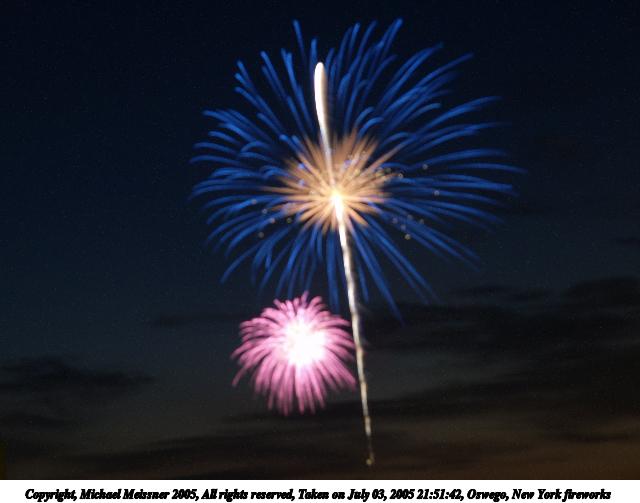 Picture #5: Oswego, New York fireworks #5 640x503, 39,025 bytes (39K), (html file) Copyright, Michael Meissner 2005, All rights reserved Olympus E-1 camera with Olympus 14-54mm f/2.8-3.5 lens f/5.6, ISO 100, 4 sec, 54.0mm, manual mode, SHQ, matrix metering, -2 contrast, +2 sharpening, manual focus 35mm equivalent focal length 108.0mm Extra equipment used: Tripod, RM-CB01 cable release Taken by Michael Meissner on July 03, 2005 21:51:42 Last modified on July 04, 2005 at 21:13 |