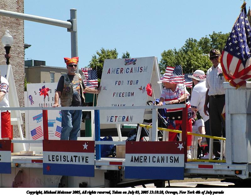 Picture #17: Oswego, New York 4th of July parade #14 800x623, 142,604 bytes (140K), (html file) Copyright, Michael Meissner 2005, All rights reserved Olympus C-2100UZ camera f/5.0, ISO 100, 1/500 sec, 17.3mm, auto mode, SHQ, cloudy, matrix metering 35mm equivalent focal length 96.0mm Taken by Michael Meissner on July 03, 2005 13:36:16 Last modified on July 03, 2005 at 20:17 |