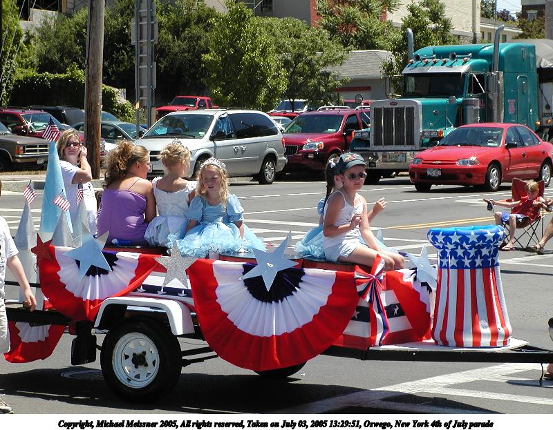 Picture #11: Oswego, New York 4th of July parade #8 800x623, 139,260 bytes (136K), (html file) Copyright, Michael Meissner 2005, All rights reserved Olympus C-2100UZ camera f/5.6, ISO 100, 1/500 sec, 25.2mm, auto mode, SHQ, cloudy, matrix metering 35mm equivalent focal length 140.0mm Taken by Michael Meissner on July 03, 2005 13:29:51 Last modified on July 03, 2005 at 20:17 One of the things I noticed is some of the ride goers didn't seem to get into the spirit of things, like these dancers. |