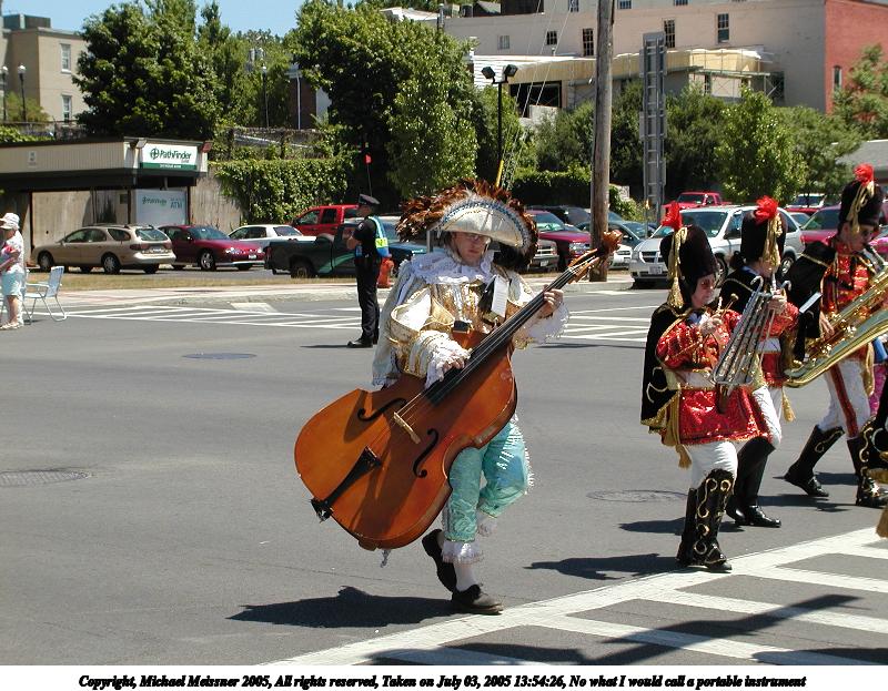 Picture #26: No what I would call a portable instrument 800x623, 126,303 bytes (124K), (html file) Copyright, Michael Meissner 2005, All rights reserved Olympus C-2100UZ camera f/5.0, ISO 100, 1/650 sec, 16.2mm, auto mode, SHQ, cloudy, matrix metering 35mm equivalent focal length 90.0mm Taken by Michael Meissner on July 03, 2005 13:54:26 Last modified on July 03, 2005 at 20:17 |