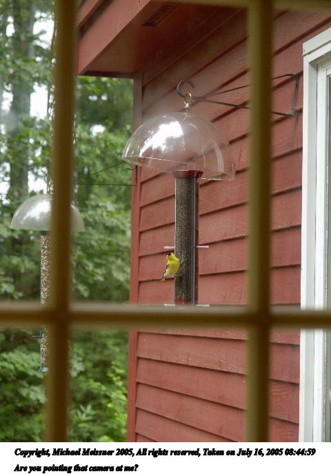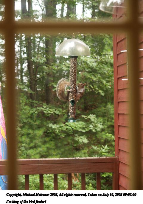 Picture #1: I'm king of the bird feeder! 480x686, 69,322 bytes (68K), (html file) Copyright, Michael Meissner 2005, All rights reserved Olympus E-1 camera with Olympus 14-54mm f/2.8-3.5 lens f/3.5, ISO 400, 1/125 sec, 54.0mm, auto mode, SHQ, matrix metering, +2 sharpening 35mm equivalent focal length 108.0mm Taken by Michael Meissner on July 16, 2005 09:05:20 Last modified on July 16, 2005 at 09:22 |