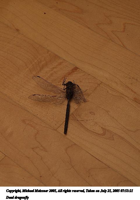 Picture #6: Dead dragonfly 480x686, 50,546 bytes (50K), (html file) Copyright, Michael Meissner 2005, All rights reserved Olympus E-1 camera with Olympus 14-54mm f/2.8-3.5 lens f/8.0, ISO 100, ext. flash, 1/160 sec, 51.0mm, manual mode, SHQ, matrix metering, +2 sharpening, continous focus 35mm equivalent focal length 102.0mm Extra equipment used: Promaster 5750DX flash Taken by Michael Meissner on July 25, 2005 07:53:21 Last modified on July 25, 2005 at 08:42 I heard scratching at the door, and opened it thinking a cat wanted to get in. This dragonfly had been hitting the screen and came in. I couldn't chase it back out. Our indoor cat Abba went into chase mode, and sometime in the night she got it. |
