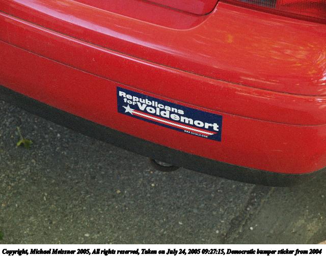 Picture #1: Democratic bumper sticker from 2004 640x503, 63,533 bytes (63K), (html file) Copyright, Michael Meissner 2005, All rights reserved Olympus E-1 camera with Olympus 14-54mm f/2.8-3.5 lens f/4.0, ISO 800, 1/160 sec, 54.0mm, auto mode, SHQ, matrix metering, +2 sharpening 35mm equivalent focal length 108.0mm Taken by Michael Meissner on July 24, 2005 09:27:15 Last modified on July 24, 2005 at 17:33 |