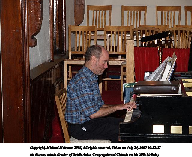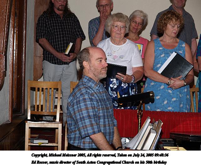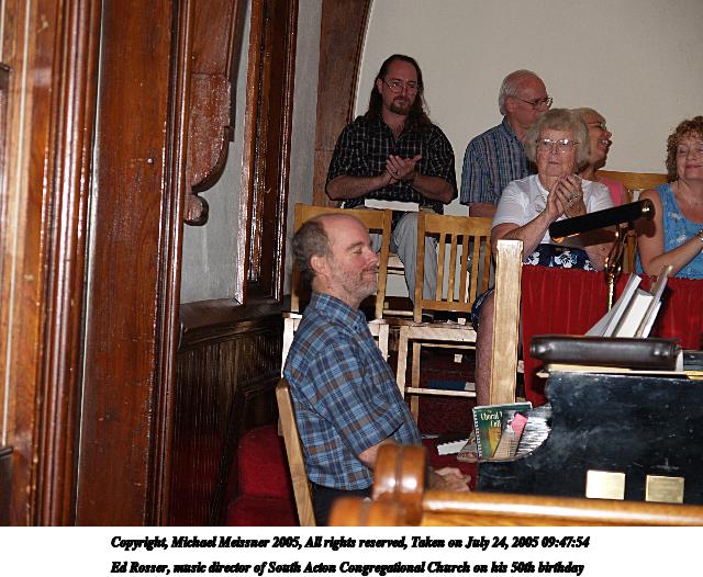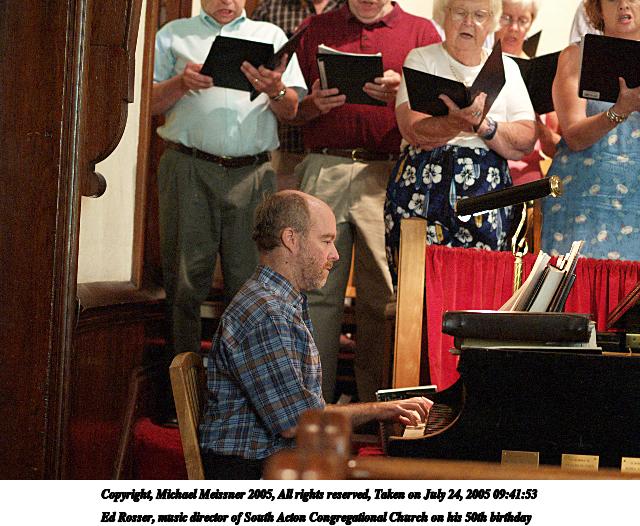 Picture #5: Ed Rosser, music director of South Acton Congregational Church on his 50th birthday #5 640x526, 63,384 bytes (62K), (html file) Copyright, Michael Meissner 2005, All rights reserved Olympus E-1 camera with Olympus 50mm f/2.0 lens f/2.0, ISO 800, 1/40 sec, 50.0mm, auto mode, SHQ, matrix metering, +2 sharpening 35mm equivalent focal length 100.0mm Taken by Michael Meissner on July 24, 2005 10:23:53 Last modified on July 24, 2005 at 17:34 |