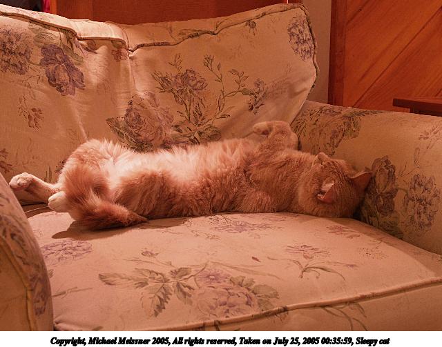 Picture #9: Sleepy cat 640x503, 67,805 bytes (67K), (html file) Copyright, Michael Meissner 2005, All rights reserved Olympus E-1 camera with Olympus 14-54mm f/2.8-3.5 lens f/5.6, ISO 100, 0.8 sec, 28.0mm, aperture priority, SHQ, matrix metering, +2 sharpening, continous focus 35mm equivalent focal length 56.0mm Extra equipment used: Tripod Taken by Michael Meissner on July 25, 2005 00:35:59 Last modified on July 26, 2005 at 00:00 |