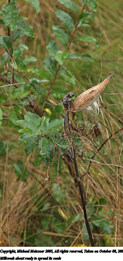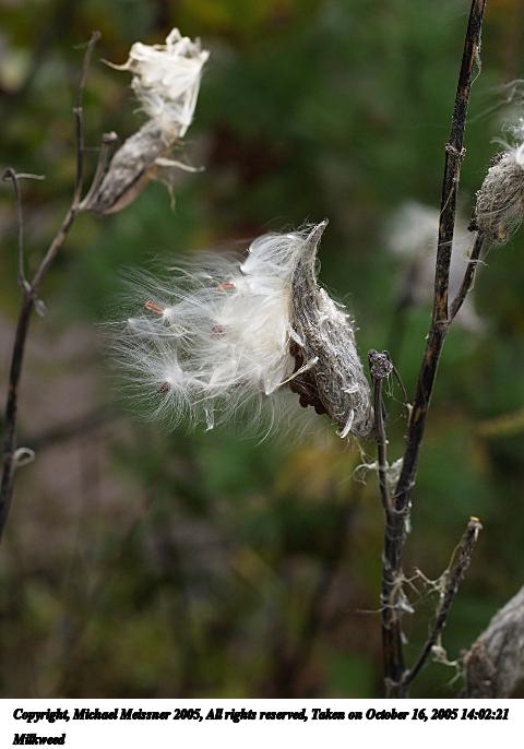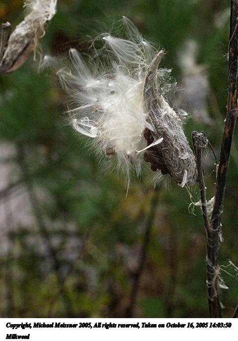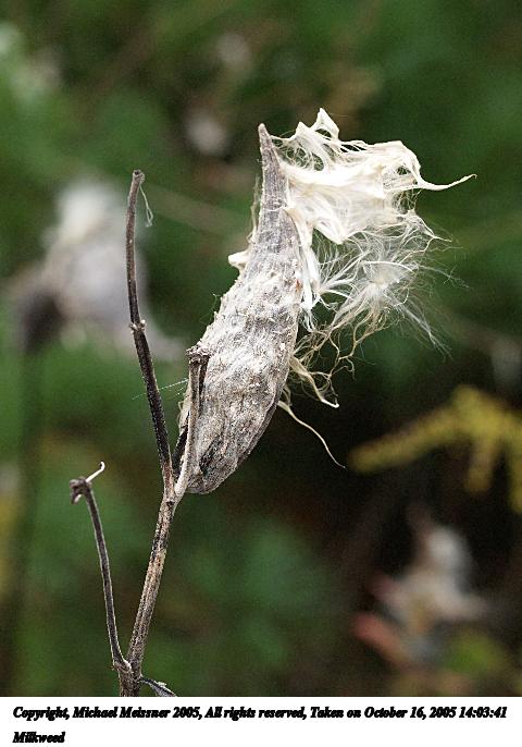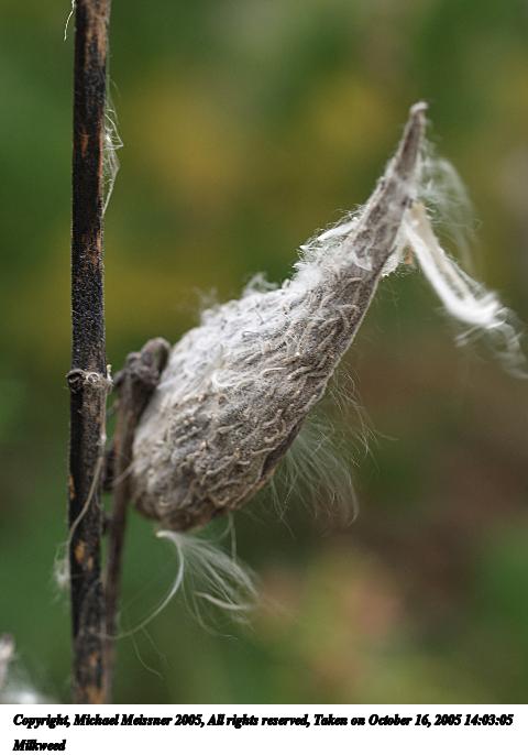 Picture #19: Milkweed #5 480x686, 60,564 bytes (60K), (html file) Copyright, Michael Meissner 2005, All rights reserved Olympus E-1 camera with Olympus 50-200mm f/2.8-3.5 lens f/3.5, ISO 400, 1/250 sec, 88.0mm, auto mode, SHQ, matrix metering, +2 sharpening 35mm equivalent focal length 176.0mm Taken by Michael Meissner on October 08, 2005 13:38:42 Last modified on October 08, 2005 at 18:17 |
