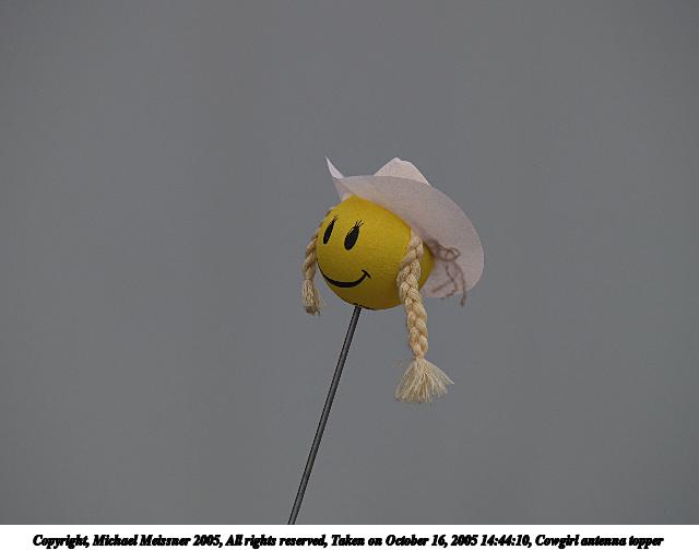 Picture #80: Cowgirl antenna topper 640x503, 25,904 bytes (26K), (html file) Copyright, Michael Meissner 2005, All rights reserved Olympus E-1 camera with Olympus 50-200mm f/2.8-3.5 lens f/4.5, ISO 100, 1/400 sec, 200.0mm, auto mode, SHQ, matrix metering, +2 sharpening 35mm equivalent focal length 401.0mm Taken by Michael Meissner on October 16, 2005 14:44:10 Last modified on October 16, 2005 at 21:27 |