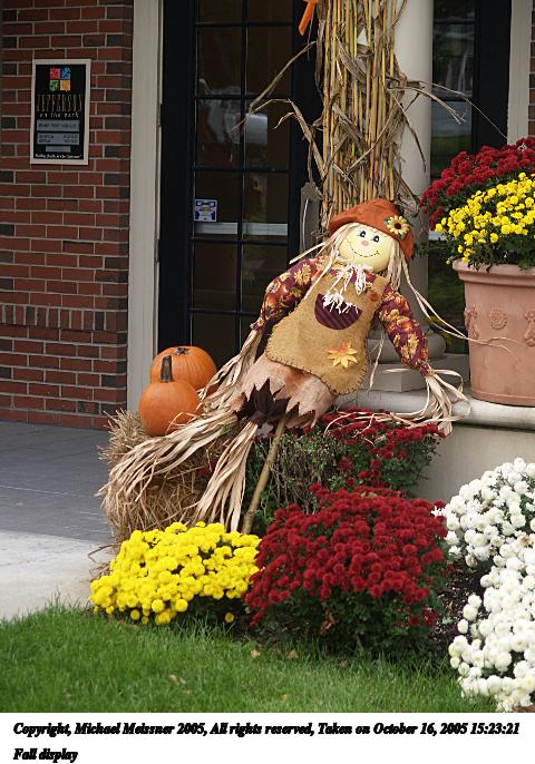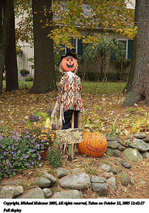Picture #96: Fall display 640x503, 126,741 bytes (124K), (html file) Copyright, Michael Meissner 2005, All rights reserved Olympus E-1 camera with Olympus 14-54mm f/2.8-3.5 lens f/3.5, ISO 100, 1/125 sec, 54.0mm, auto mode, SHQ, matrix metering, +2 sharpening 35mm equivalent focal length 108.0mm Taken by Michael Meissner on October 09, 2005 11:51:43 Last modified on October 09, 2005 at 18:27 |