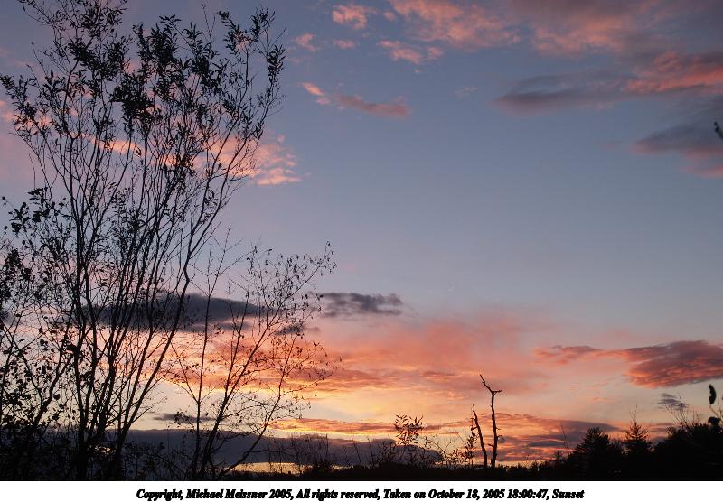 Picture #61: Sunset clouds 640x503, 45,983 bytes (45K), (html file) Copyright, Michael Meissner 2005, All rights reserved Olympus E-1 camera with Olympus 14-54mm f/2.8-3.5 lens f/3.5, ISO 100, 1/80 sec, 25.0mm, auto mode, SHQ, spot metering, bias 0.7, +2 sharpening, Exposure bracketing (shot 4) 35mm equivalent focal length 50.0mm Taken by Michael Meissner on October 18, 2005 18:01:07 Last modified on October 18, 2005 at 18:20 |
