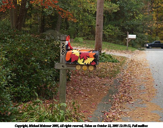 Picture #48: Fall mailbox 640x503, 104,438 bytes (102K), (html file) Copyright, Michael Meissner 2005, All rights reserved Olympus E-1 camera with Olympus 14-54mm f/2.8-3.5 lens f/4.0, ISO 200, 1/160 sec, 54.0mm, auto mode, SHQ, matrix metering, +2 sharpening 35mm equivalent focal length 108.0mm Taken by Michael Meissner on October 22, 2005 12:39:12 Last modified on October 22, 2005 at 19:35 |