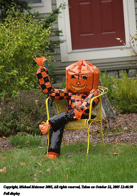 Picture #50: Fall display #4 800x623, 163,050 bytes (160K), (html file) Copyright, Michael Meissner 2005, All rights reserved Olympus E-1 camera with Olympus 14-54mm f/2.8-3.5 lens f/3.5, ISO 100, 1/80 sec, 54.0mm, auto mode, SHQ, matrix metering, +2 sharpening 35mm equivalent focal length 108.0mm Taken by Michael Meissner on October 22, 2005 12:38:54 Last modified on October 22, 2005 at 19:35 |