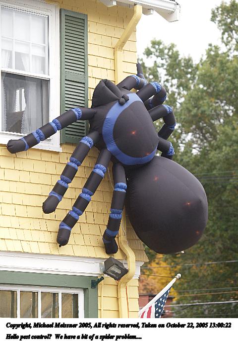 Picture #45: Hello pest control? We have a bit of a spider problem.... 480x686, 79,363 bytes (78K), (html file) Copyright, Michael Meissner 2005, All rights reserved Olympus E-1 camera with Olympus 50-200mm f/2.8-3.5 lens f/3.2, ISO 200, 1/200 sec, 83.0mm, auto mode, SHQ, matrix metering, +2 sharpening 35mm equivalent focal length 166.0mm Taken by Michael Meissner on October 22, 2005 13:00:22 Last modified on October 22, 2005 at 19:35 |
