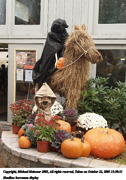 Picture #38: Headless horseman display 480x686, 105,909 bytes (104K), (html file) Copyright, Michael Meissner 2005, All rights reserved Olympus E-1 camera with Olympus 14-54mm f/2.8-3.5 lens f/4.5, ISO 200, 1/125 sec, 27.0mm, auto mode, SHQ, matrix metering, +2 sharpening 35mm equivalent focal length 54.0mm Taken by Michael Meissner on October 22, 2005 13:30:31 Last modified on October 22, 2005 at 19:36 |