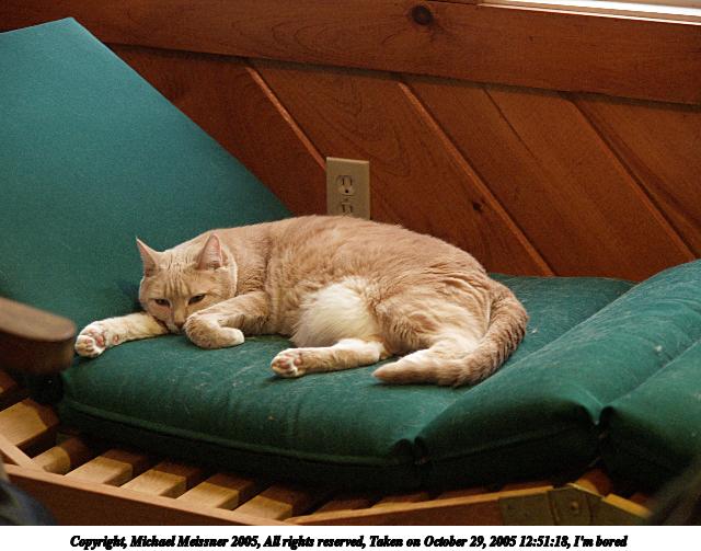 Picture #18: I'm bored 640x503, 59,850 bytes (59K), (html file) Copyright, Michael Meissner 2005, All rights reserved Olympus E-1 camera with Olympus 14-54mm f/2.8-3.5 lens f/3.5, ISO 400, 1/40 sec, 54.0mm, auto mode, SHQ, matrix metering, +2 sharpening 35mm equivalent focal length 108.0mm Taken by Michael Meissner on October 29, 2005 12:51:18 Last modified on October 29, 2005 at 13:22 |
