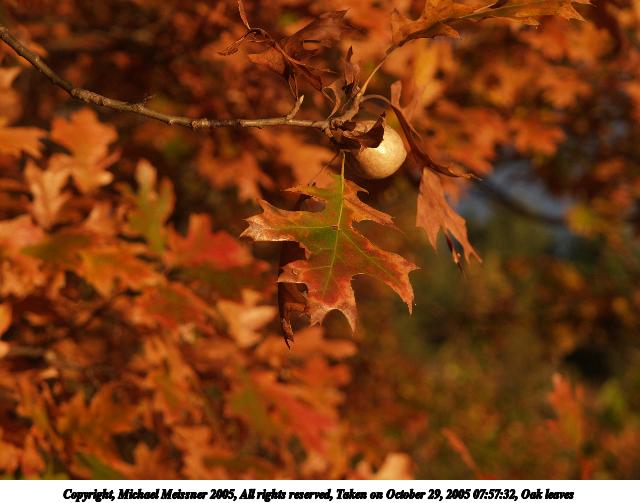 Picture #7: Oak leaves 640x503, 55,608 bytes (55K), (html file) Copyright, Michael Meissner 2005, All rights reserved Olympus E-1 camera with Olympus 14-54mm f/2.8-3.5 lens f/4.5, ISO 100, 1/400 sec, 54.0mm, shutter priority, SHQ, spot metering, +2 sharpening, Exposure bracketing (shot 1) 35mm equivalent focal length 108.0mm Taken by Michael Meissner on October 29, 2005 07:57:32 Last modified on October 29, 2005 at 10:35 |