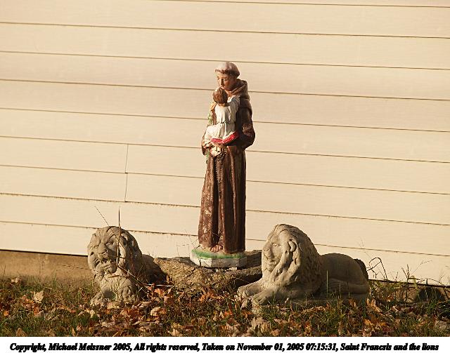 Picture #88: Saint Francsis and the lions 640x503, 69,458 bytes (68K), (html file) Copyright, Michael Meissner 2005, All rights reserved Olympus E-1 camera with Olympus 50-200mm f/2.8-3.5 lens f/5.0, ISO 100, 1/400 sec, 182.0mm, auto mode, SHQ, spot metering, +2 sharpening 35mm equivalent focal length 365.0mm Taken by Michael Meissner on November 01, 2005 07:15:31 Last modified on November 01, 2005 at 07:51 |