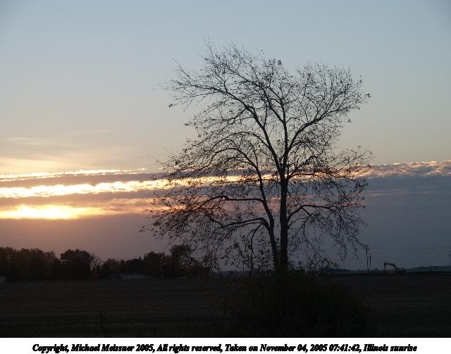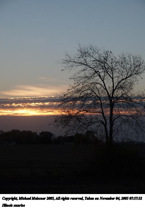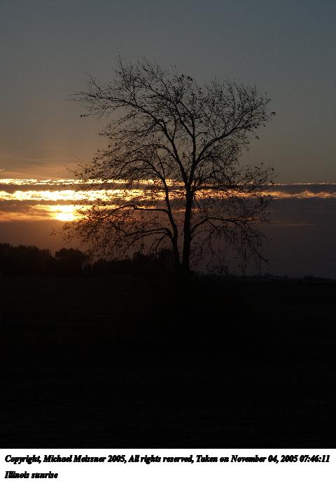 Picture #64: Illinois sunrise #5 480x686, 53,067 bytes (52K), (html file) Copyright, Michael Meissner 2005, All rights reserved Olympus E-1 camera with Olympus 14-54mm f/2.8-3.5 lens f/5.0, ISO 100, 1/250 sec, 52.0mm, auto mode, SHQ, spot metering, bias -1.0, +2 sharpening, Exposure bracketing (shot 3) 35mm equivalent focal length 104.0mm Taken by Michael Meissner on November 04, 2005 07:37:32 Last modified on November 11, 2005 at 23:08 |