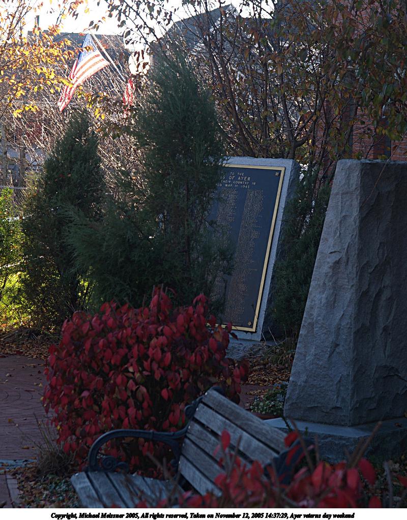 Picture #59: Ayer veterns day weekend 800x1023, 201,551 bytes (197K), (html file) Copyright, Michael Meissner 2005, All rights reserved Olympus E-1 camera with Olympus 14-54mm f/2.8-3.5 lens f/4.0, ISO 100, 1/160 sec, 51.0mm, auto mode, SHQ, matrix metering, +2 sharpening 35mm equivalent focal length 102.0mm Taken by Michael Meissner on November 12, 2005 14:37:29 Last modified on November 12, 2005 at 22:21 |