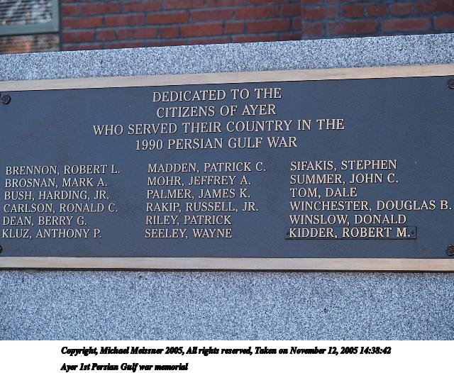 Picture #57: Ayer 1st Persian Gulf war memorial 640x526, 99,887 bytes (98K), (html file) Copyright, Michael Meissner 2005, All rights reserved Olympus E-1 camera with Olympus 14-54mm f/2.8-3.5 lens f/3.5, ISO 100, 1/125 sec, 51.0mm, auto mode, SHQ, matrix metering, +2 sharpening 35mm equivalent focal length 102.0mm Taken by Michael Meissner on November 12, 2005 14:38:42 Last modified on November 12, 2005 at 22:21 |