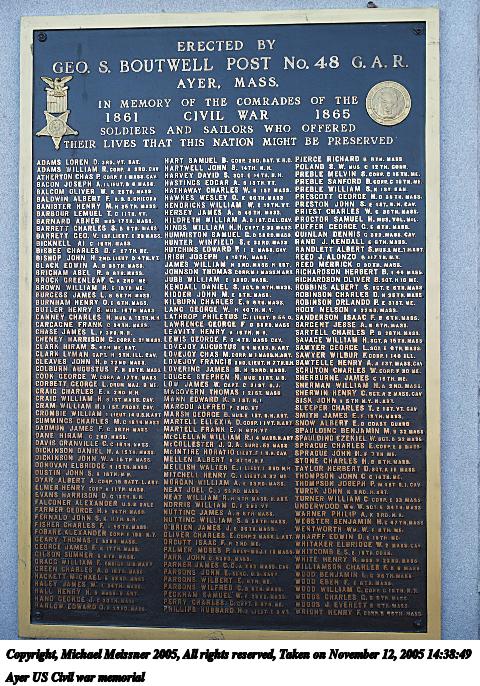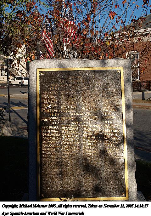 Picture #55: Ayer Spanish-American and World War I memorials 480x686, 135,427 bytes (133K), (html file) Copyright, Michael Meissner 2005, All rights reserved Olympus E-1 camera with Olympus 14-54mm f/2.8-3.5 lens f/8.0, ISO 100, 1/400 sec, 29.0mm, auto mode, SHQ, matrix metering, +2 sharpening 35mm equivalent focal length 58.0mm Taken by Michael Meissner on November 12, 2005 14:38:57 Last modified on November 12, 2005 at 22:21 |