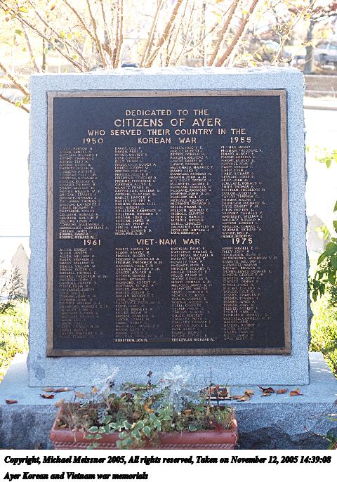 Picture #54: Ayer Korean and Vietnam war memorials 480x686, 107,924 bytes (106K), (html file) Copyright, Michael Meissner 2005, All rights reserved Olympus E-1 camera with Olympus 14-54mm f/2.8-3.5 lens f/3.5, ISO 200, 1/100 sec, 40.0mm, auto mode, SHQ, matrix metering, +2 sharpening 35mm equivalent focal length 80.0mm Taken by Michael Meissner on November 12, 2005 14:39:08 Last modified on November 12, 2005 at 22:21 |