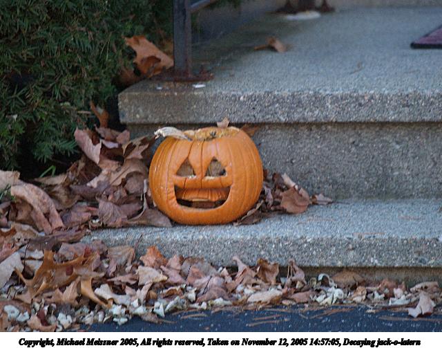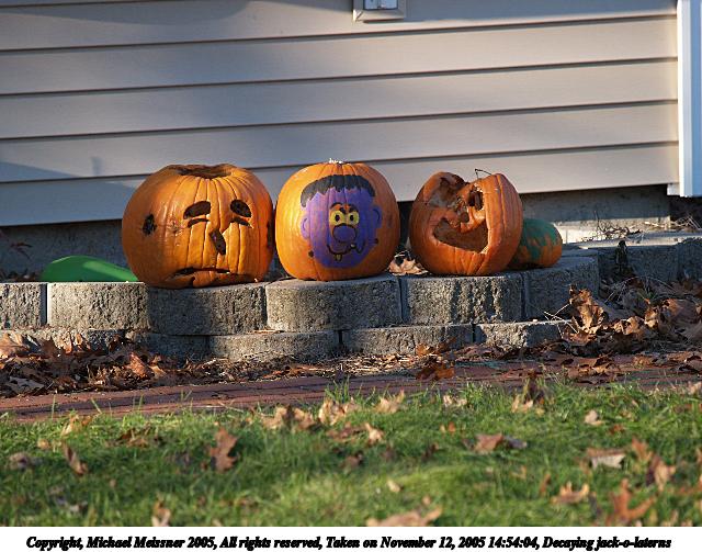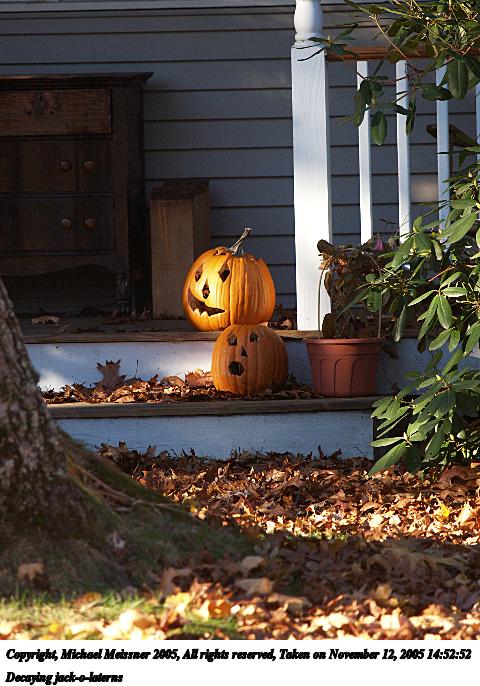 Picture #50: Decaying jack-o-laterns #2 640x503, 83,574 bytes (82K), (html file) Copyright, Michael Meissner 2005, All rights reserved Olympus E-1 camera with Olympus 50-200mm f/2.8-3.5 lens f/4.0, ISO 200, 1/250 sec, 200.0mm, auto mode, SHQ, matrix metering, +2 sharpening 35mm equivalent focal length 401.0mm Taken by Michael Meissner on November 12, 2005 14:54:04 Last modified on November 12, 2005 at 22:22 |