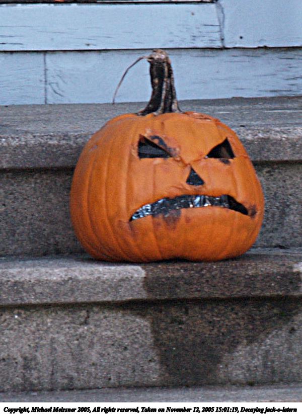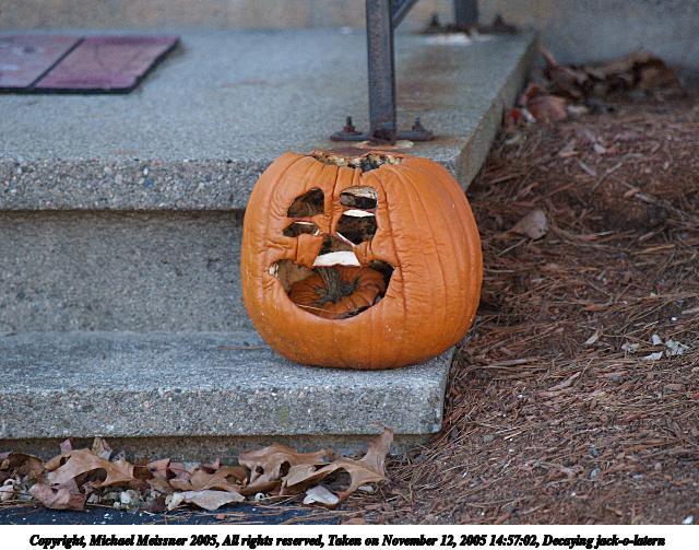 Picture #47: Decaying jack-o-latern #3 600x823, 92,102 bytes (90K), (html file) Copyright, Michael Meissner 2005, All rights reserved Olympus E-1 camera with Olympus 50-200mm f/2.8-3.5 lens f/4.0, ISO 400, 1/250 sec, 200.0mm, auto mode, SHQ, matrix metering, +2 sharpening 35mm equivalent focal length 401.0mm Taken by Michael Meissner on November 12, 2005 15:01:19 Last modified on November 12, 2005 at 22:22 |