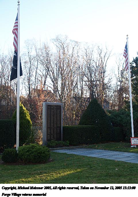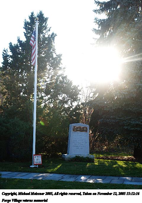 Picture #44: Forge Village veterns memorial #2 480x686, 98,437 bytes (97K), (html file) Copyright, Michael Meissner 2005, All rights reserved Olympus E-1 camera with Olympus 14-54mm f/2.8-3.5 lens f/4.5, ISO 100, 1/125 sec, 23.0mm, auto mode, SHQ, spot metering, +2 sharpening 35mm equivalent focal length 46.0mm Taken by Michael Meissner on November 12, 2005 15:13:00 Last modified on November 12, 2005 at 22:22 |
