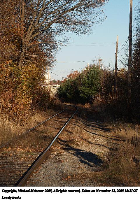 Picture #41: Lonely tracks 480x686, 120,069 bytes (118K), (html file) Copyright, Michael Meissner 2005, All rights reserved Olympus E-1 camera with Olympus 50-200mm f/2.8-3.5 lens f/7.1, ISO 400, 1/1000 sec, 79.0mm, auto mode, SHQ, matrix metering, +2 sharpening 35mm equivalent focal length 158.0mm Taken by Michael Meissner on November 12, 2005 15:21:27 Last modified on November 12, 2005 at 22:22 |