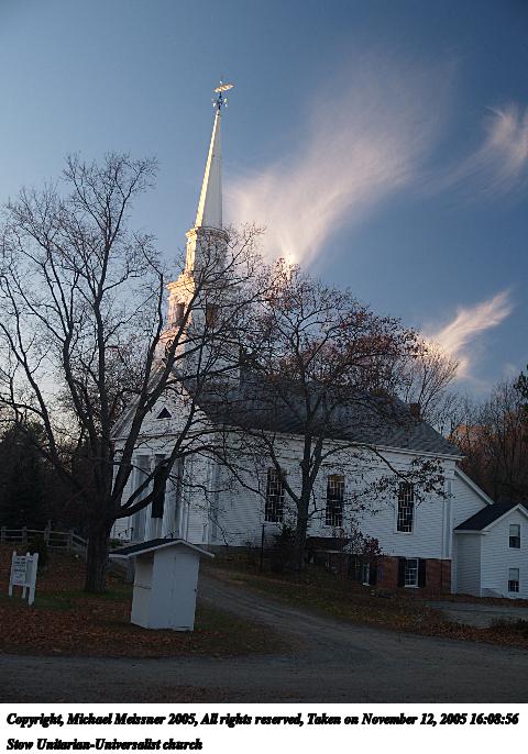 Picture #39: Stow Unitarian-Universalist church #2 480x686, 90,277 bytes (89K), (html file) Copyright, Michael Meissner 2005, All rights reserved Olympus E-1 camera with Olympus 14-54mm f/2.8-3.5 lens f/4.0, ISO 400, 1/100 sec, 27.0mm, auto mode, SHQ, matrix metering, +2 sharpening 35mm equivalent focal length 54.0mm Extra equipment used: Polarizer filter Taken by Michael Meissner on November 12, 2005 16:09:57 Last modified on November 12, 2005 at 22:22 |