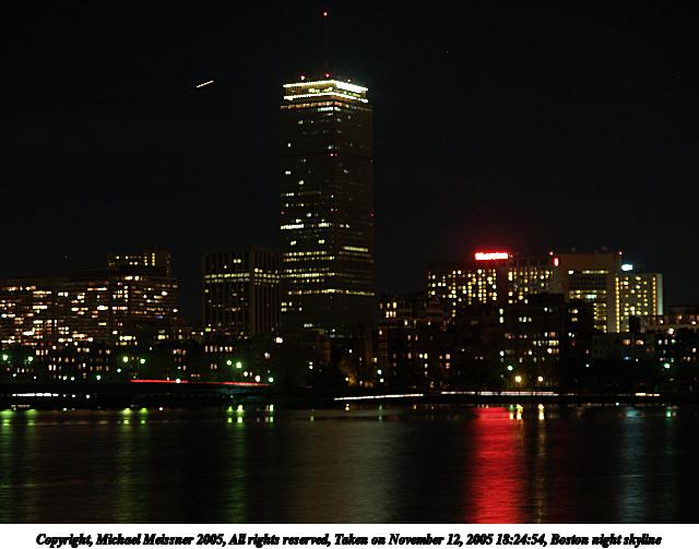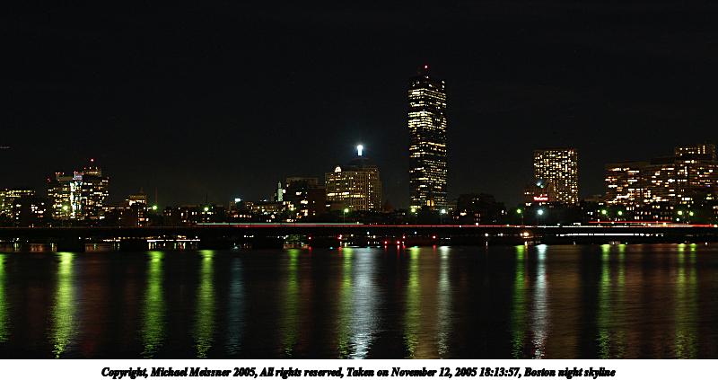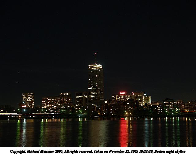 Picture #37: Boston night skyline 800x423, 59,253 bytes (58K), (html file) Copyright, Michael Meissner 2005, All rights reserved Olympus E-1 camera with Olympus 14-54mm f/2.8-3.5 lens f/4.0, ISO 100, 3.2 sec, 28.0mm, aperture priority, SHQ, matrix metering, +2 sharpening 35mm equivalent focal length 56.0mm Extra equipment used: Tripod, RM-CB01 shutter release Taken by Michael Meissner on November 12, 2005 18:13:57 Last modified on November 12, 2005 at 22:23 |