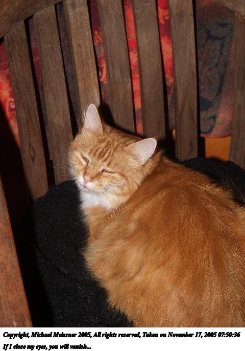 Picture #30: If I close my eyes, you will vanish... 480x686, 65,288 bytes (64K), (html file) Copyright, Michael Meissner 2005, All rights reserved Olympus E-1 camera with Olympus 14-54mm f/2.8-3.5 lens f/5.6, ISO 100, FL-50 flash, 1/100 sec, 54.0mm, aperture priority, SHQ, matrix metering, +2 sharpening 35mm equivalent focal length 108.0mm Extra equipment used: FL-50 flash Taken by Michael Meissner on November 17, 2005 07:50:36 Last modified on November 17, 2005 at 07:57 |