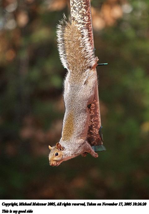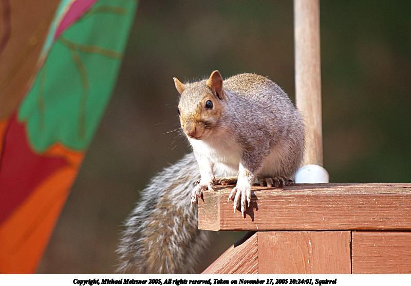 Picture #24: Squirrel #4 480x686, 57,164 bytes (56K), (html file) Copyright, Michael Meissner 2005, All rights reserved Olympus E-1 camera ISO 200, 1/200 sec, aperture priority, SHQ, matrix metering, +2 sharpening, continous focus 35mm equivalent focal length 0.0mm Extra equipment used: Vivitar 70-210mm lens Taken by Michael Meissner on November 17, 2005 10:30:07 Last modified on November 17, 2005 at 10:37 |