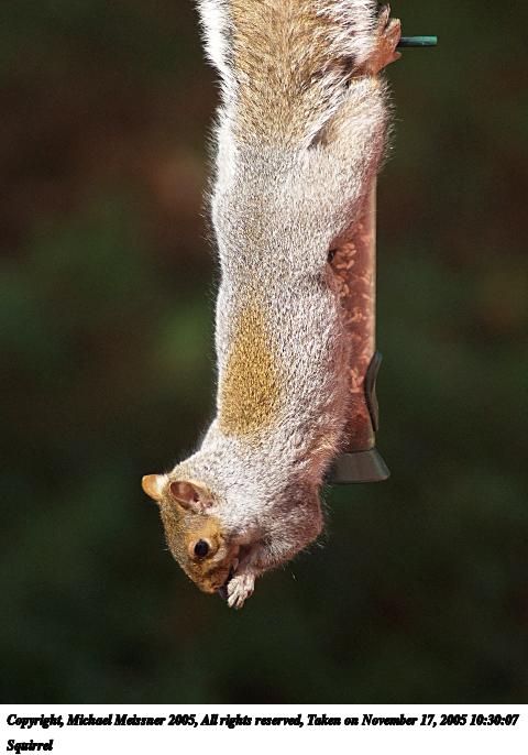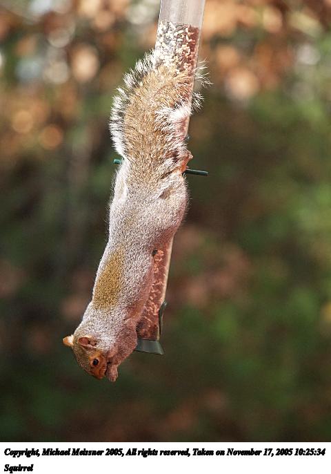 Picture #28: Squirrel #2 800x556, 71,309 bytes (70K), (html file) Copyright, Michael Meissner 2005, All rights reserved Olympus E-1 camera with Olympus 50-200mm f/2.8-3.5 lens f/3.5, ISO 200, 1/200 sec, 200.0mm, aperture priority, SHQ, spot metering, +2 sharpening 35mm equivalent focal length 401.0mm Taken by Michael Meissner on November 17, 2005 10:24:01 Last modified on November 17, 2005 at 10:36 |