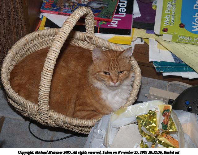 Picture #23: Basket cat 640x503, 75,884 bytes (75K), (html file) Copyright, Michael Meissner 2005, All rights reserved Olympus E-1 camera with Olympus 14-54mm f/2.8-3.5 lens f/4.0, ISO 100, FL-50 flash, fp-ttl, 1/80 sec, 42.0mm, aperture priority, SHQ, matrix metering, +2 sharpening 35mm equivalent focal length 84.0mm Extra equipment used: FL-50 flash Taken by Michael Meissner on November 25, 2005 18:12:36 Last modified on November 25, 2005 at 20:59 |