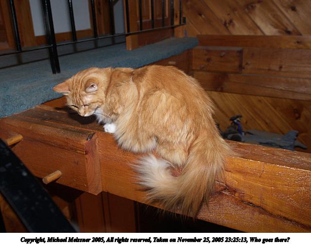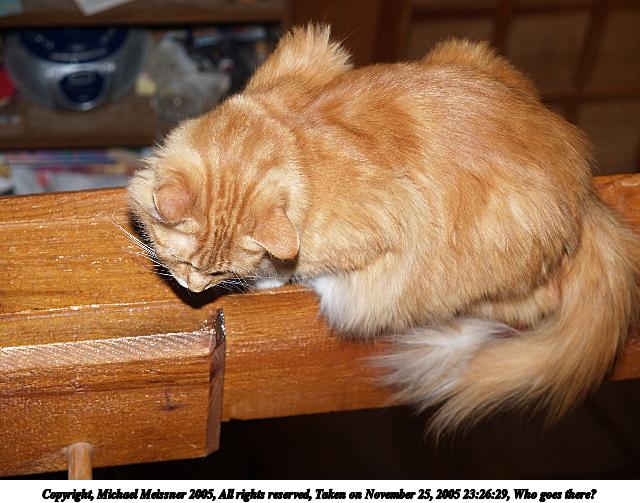 Picture #22: Who goes there? 640x503, 59,467 bytes (59K), (html file) Copyright, Michael Meissner 2005, All rights reserved Olympus E-1 camera with Olympus 14-54mm f/2.8-3.5 lens f/4.0, ISO 100, FL-50 flash, 1/30 sec, 17.0mm, aperture priority, SHQ, matrix metering, +2 sharpening 35mm equivalent focal length 34.0mm Extra equipment used: FL-50 flash Taken by Michael Meissner on November 25, 2005 23:25:13 Last modified on November 26, 2005 at 00:17 |