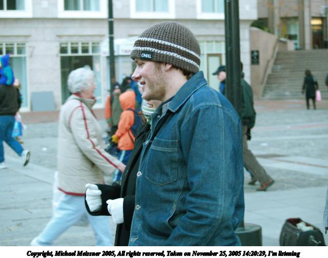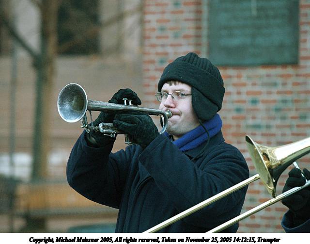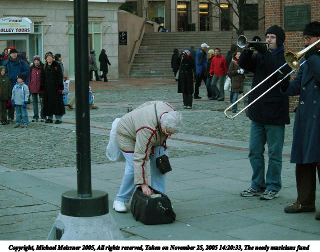Picture #11: The needy musicians fund 640x503, 71,583 bytes (70K), (html file) Copyright, Michael Meissner 2005, All rights reserved Olympus E-1 camera with Olympus 40-150mm f/3.5-4.5 lens f/4.0, ISO 400, 1/250 sec, 40.0mm, aperture priority, SHQ, matrix metering, +2 sharpening 35mm equivalent focal length 80.0mm Taken by Michael Meissner on November 25, 2005 14:20:33 Last modified on November 25, 2005 at 17:59 |