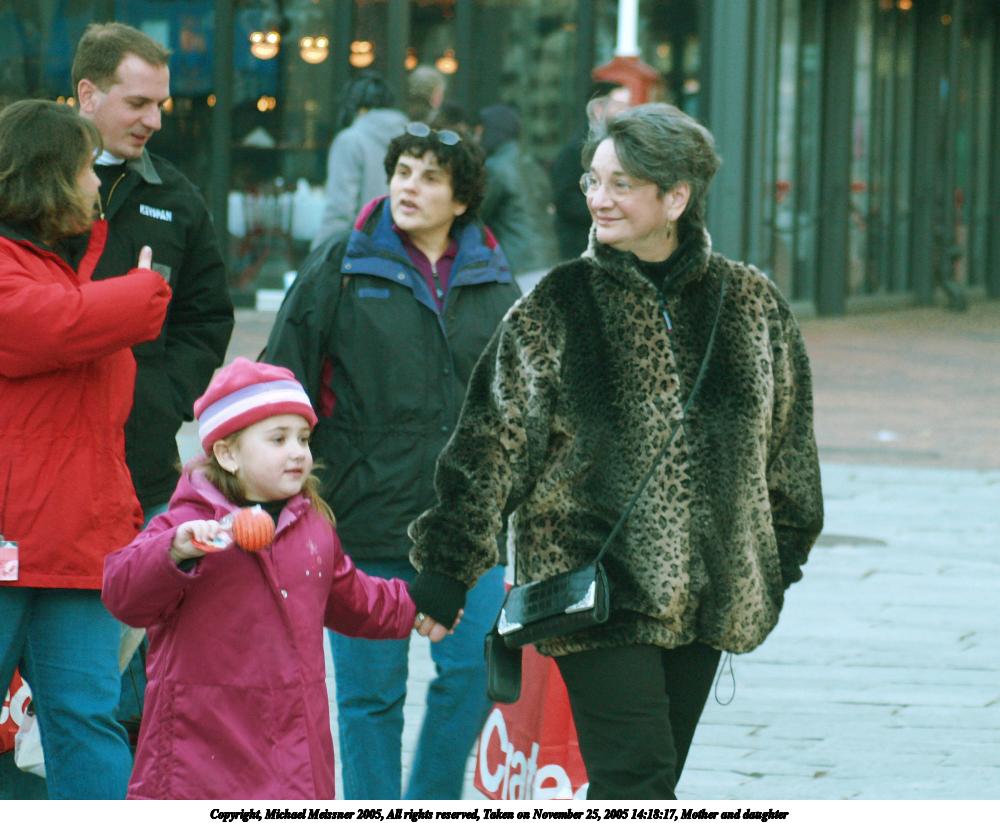 Picture #8: Girl and her mother 640x503, 79,763 bytes (78K), (html file) Copyright, Michael Meissner 2005, All rights reserved Olympus E-1 camera with Olympus 40-150mm f/3.5-4.5 lens f/4.0, ISO 400, 1/320 sec, 65.0mm, aperture priority, SHQ, matrix metering, +2 sharpening 35mm equivalent focal length 130.0mm Taken by Michael Meissner on November 25, 2005 14:38:14 Last modified on November 25, 2005 at 17:59 |