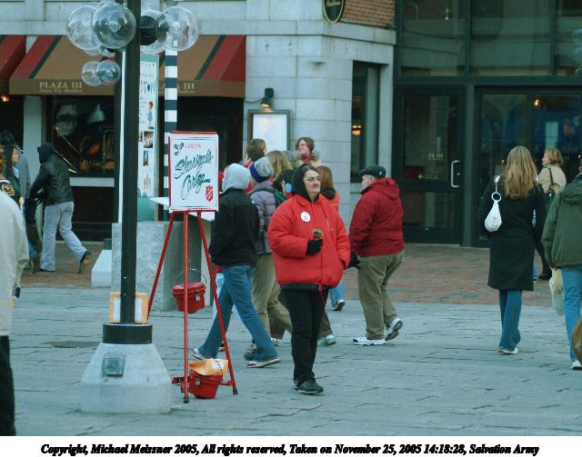 Picture #13: Salvation Army 640x503, 68,758 bytes (68K), (html file) Copyright, Michael Meissner 2005, All rights reserved Olympus E-1 camera with Sigma 55-200mm f/4.0-5.6 lens f/4.3, ISO 400, 1/160 sec, 78.0mm, aperture priority, SHQ, matrix metering, +2 sharpening 35mm equivalent focal length 156.0mm Taken by Michael Meissner on November 25, 2005 14:18:28 Last modified on November 25, 2005 at 17:58 |